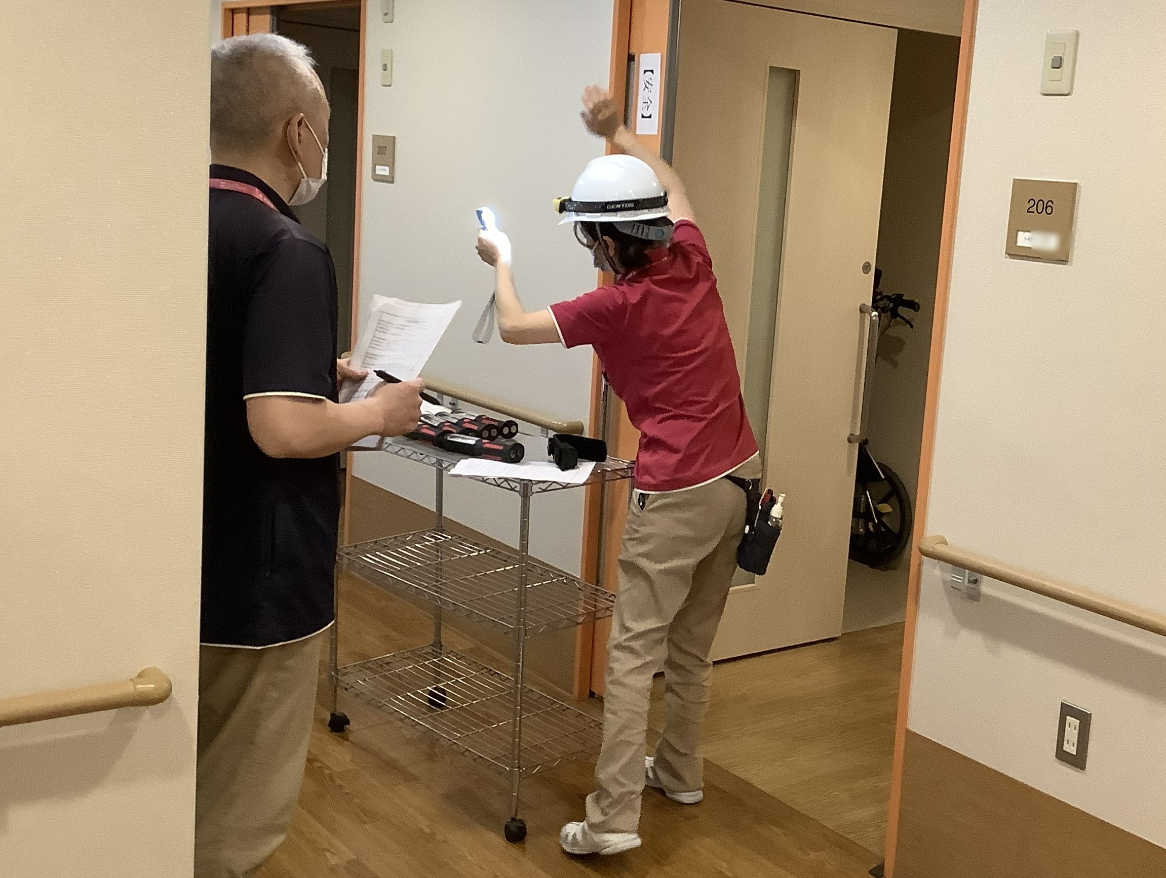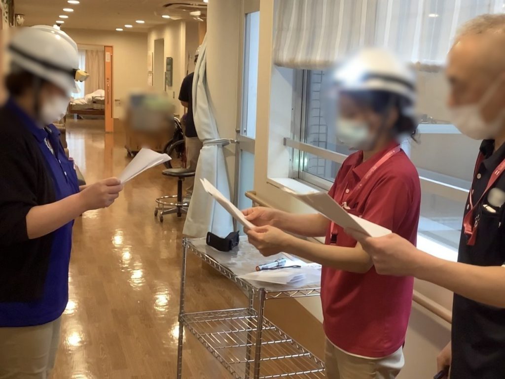夜間帯の23時に地震が起きたことを想定。皆様がお休みになっている時間帯の為、職員は各居室を回って安否確認と被害状況を確認、非常灯の設置や報告の訓練を行いました。