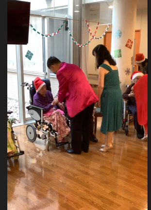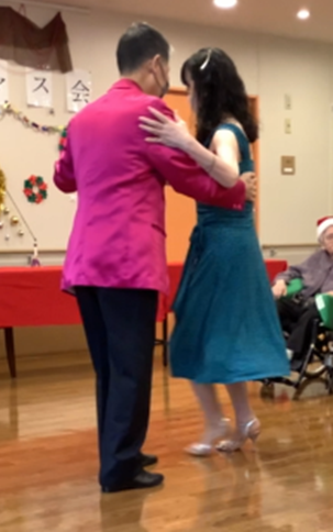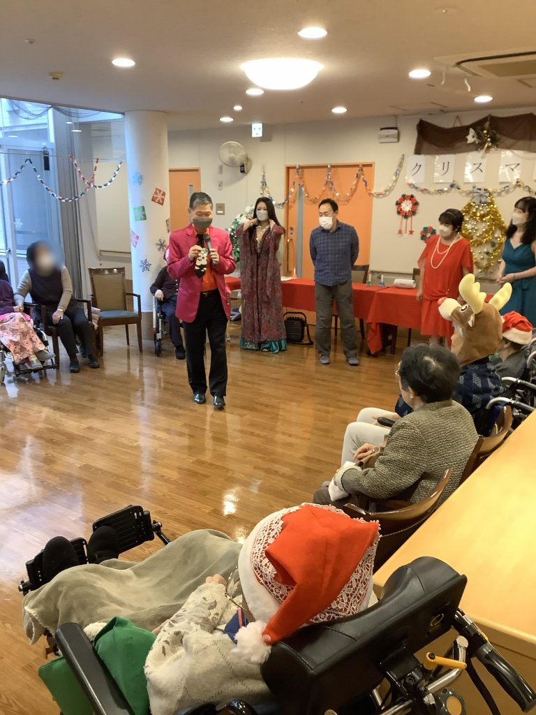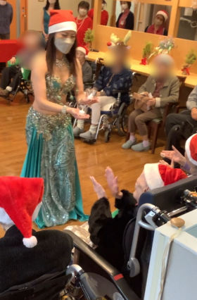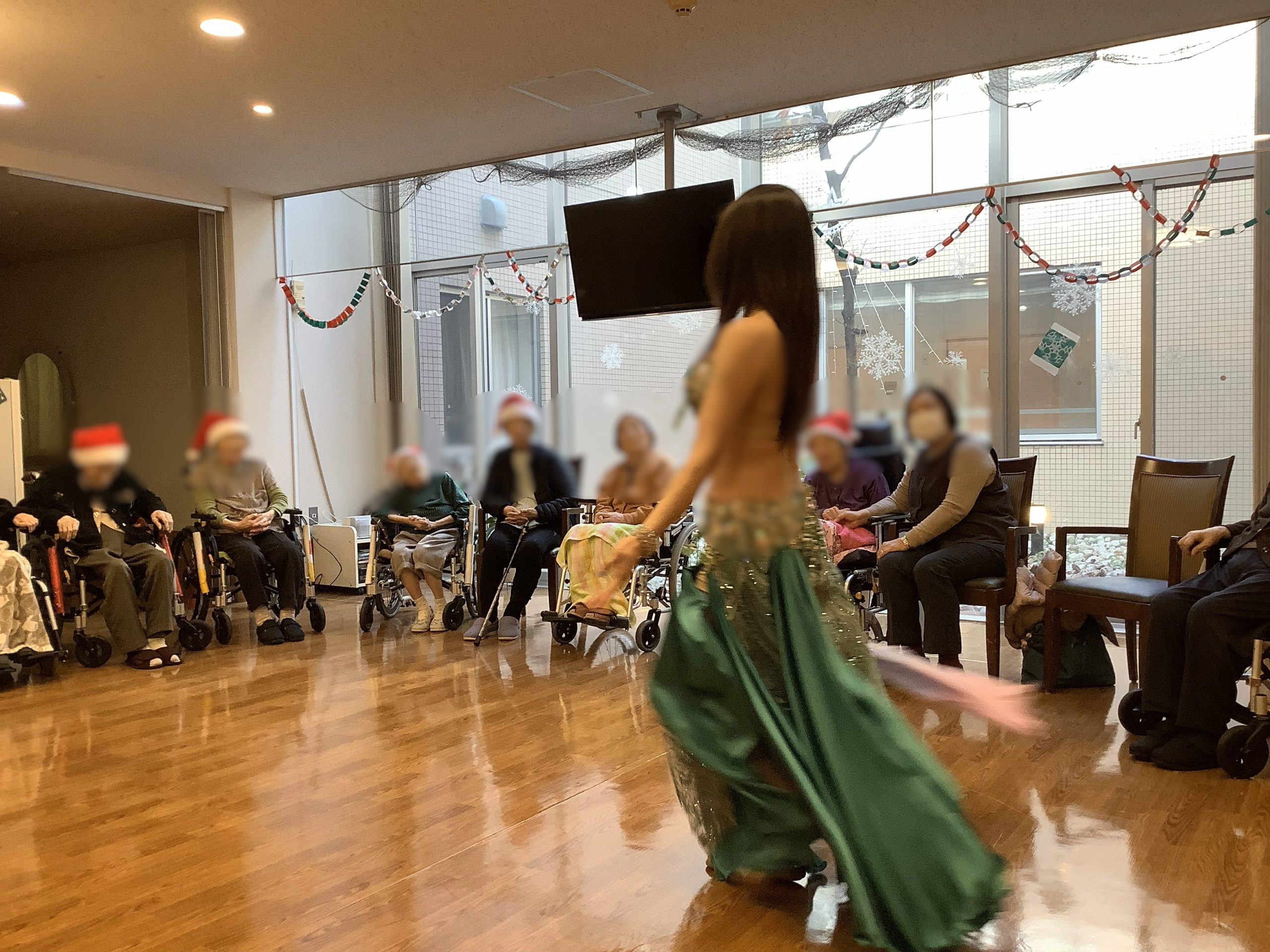 今回は特別に「クリスマスバージョン」で踊りとベリーダンスを披露していただきました。ベリーダンスのグッチさんの衣装と妖艶なダンスにうっとり…。踊りだけではなく、入居者様と一緒に合唱やトークで楽しませていただきました✨